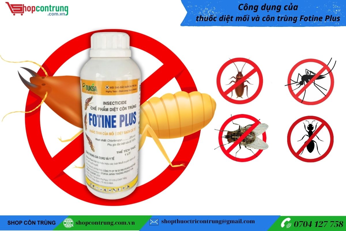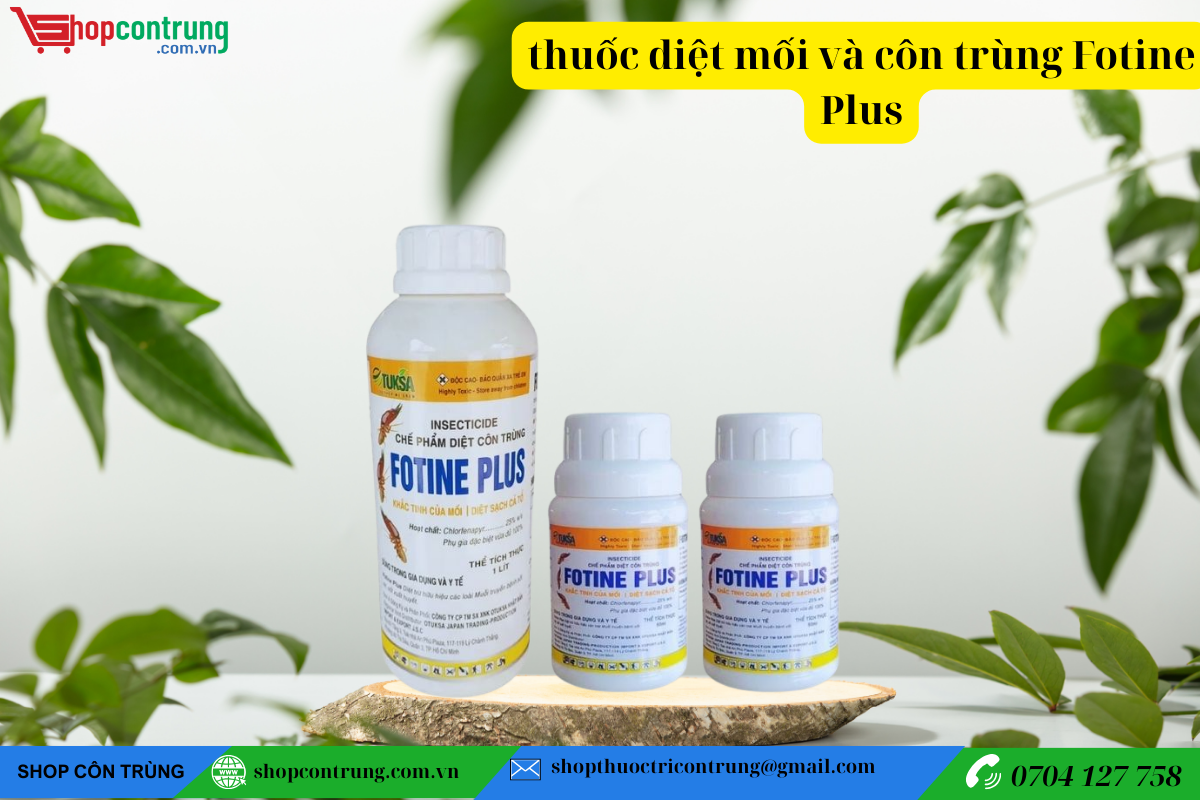 Fotine Plus là thuốc diệt mối sinh học có công dụng hiệu quả trong việc phòng trừ các loài mốt đất. Thuốc diệt mối Fotine Plus là sản phẩm phòng trừ mối mọt bảo vệ các công trình xây dựng bền vững theo thời gian. Không chỉ diệt mối mà Fotine Plus còn có thể diệt các loài côn trùng gây hại như muỗi, kiến, gián, mối, mọt, ruồi, bọ chét, rệp và bọ cánh cứng….Mặc dù công dụng khá Tốt nhưng giá thành của chế phẩm Fotine Plus lại chỉ ở phân khúc rẻ lên được rất nhiều đơn vị kiểm soát mối và côn trùng rất quan tâm tới và tin dùng vì hiệu quả mà Fotine Plus đem lại rất bất ngờ.